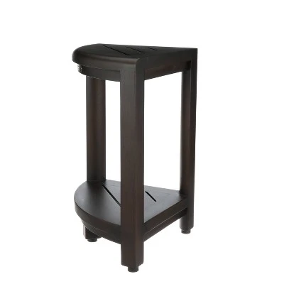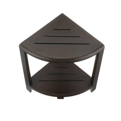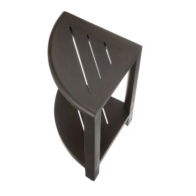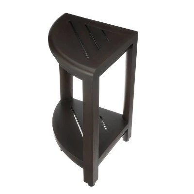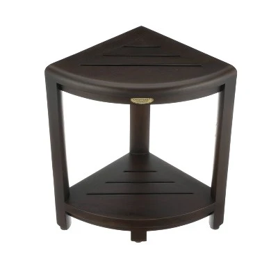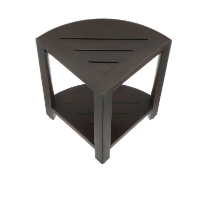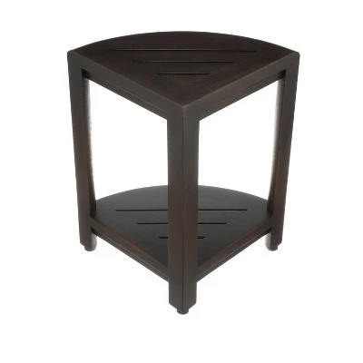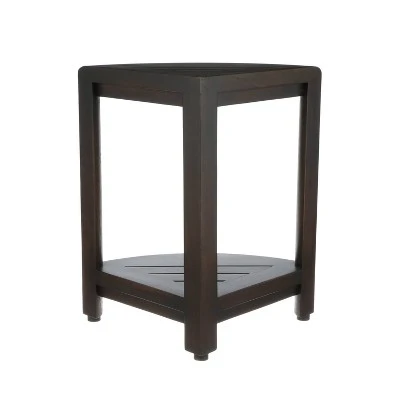 SnazzyCorner 12in Wide Teak Shower Bench with Shelf. With sides that each measure 12 inches long, with a height of 18 inches, it has a face that is 17 inches across. The included foot leveler pads allow independent adjustment of each leg to make minor adjustments for slight slopes in shower floors and to provide added non-slip stability. This piece features our Antique White finish, which is mostly white, with the yellows and browns from the teak showing through.