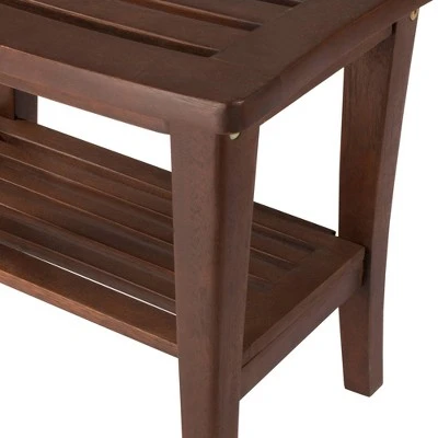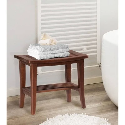 - Simple rectangle acacia wood (Acacia Mangium ) shower stool with slatted seat and fixed bottom shelf built to withstand exposure to water, moisture, humidity and the outdoors