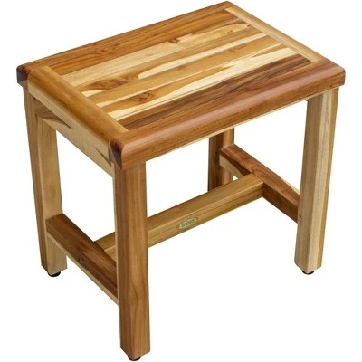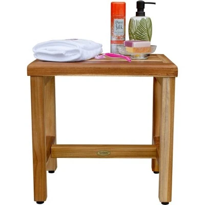 Eleganto 18in Wide Teak Shower Safety Transfer Bench. With a height of 18 inches, a width of 18 inches, and a depth of 14 inches, this bathroom seat will work great anywhere in your home or outdoors. With a Crossbar and foot levelers this bench will remain sturdy even on uneven surfaces. The natural look of this finish will look great for years to come, making it perfect for your home.