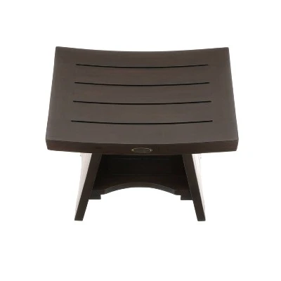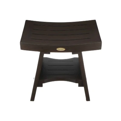 Serenity 18in Wide Teak Shower Bench with Shelf. Measuring 18 inches wide, 14 inches deep, and 18 inches in height, this bench weights 27 pounds. Designed thick for extra stability this teak shower seat still has a low profile and will fit in most showers. The included foot leveler pads allow independent adjustment of each leg to make minor adjustments for slight slopes in shower floors and to provide added non-slip stability. In a beautiful woodland brown, this bathroom seat will look great in any home.