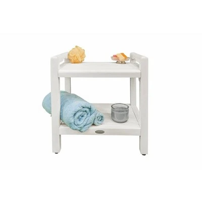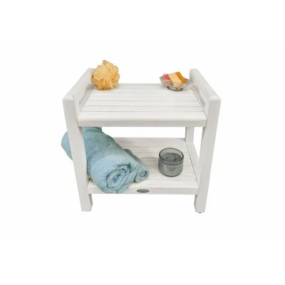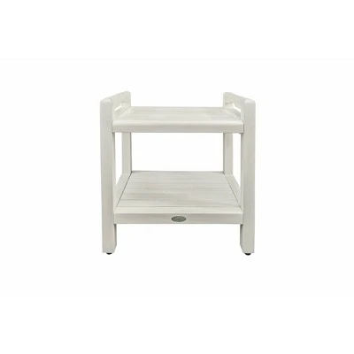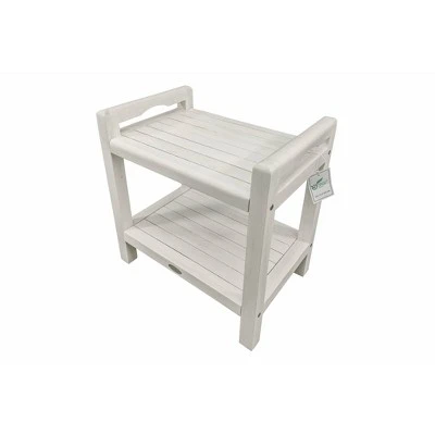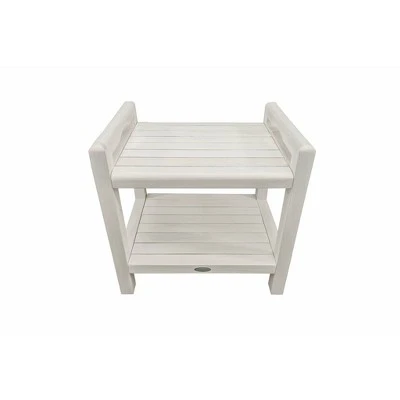 Eleganto 20in Wide Teak Shower Bench with Handles. Measuring 20 inches in length, 14 inches in depth, and 21 inches in height, this bathroom bench with LiftAide arms has a seat that is 18 inches tall, and has a lower shelf for extra storage and support. The included foot levelers will keep it even on uneven surfaces. This piece features our Antique White finish, which is mostly white, with the yellows and browns from the teak showing through.