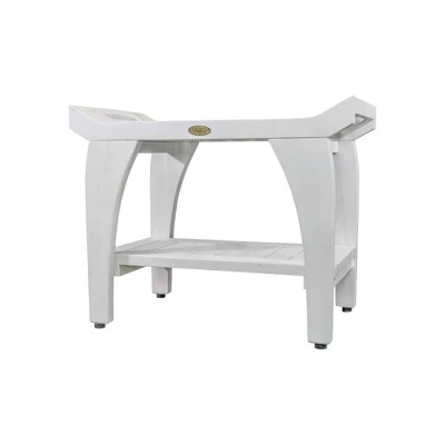 Tranquility 24in Wide Teak Shower Bench with Handles. This shower seat with extra shelf measures 24 inches in length, 14 inches in depth, and 20 inches in height, with a seat height of 18 inches. As a family owned company for over 10 years, we are proud to present this bathroom seat, manufactured from solid, sustainably sourced, certified legal teak from the island of Java in Indonesia. This piece features our Antique White finish, which is mostly white, with the yellows and browns from the teak showing through.