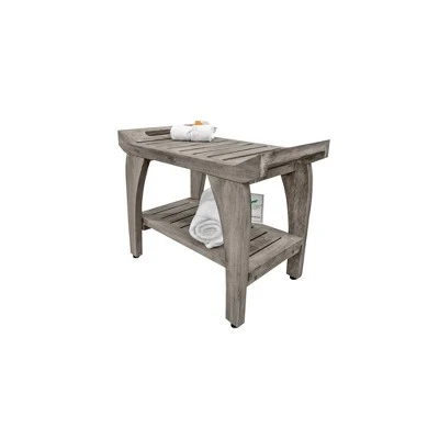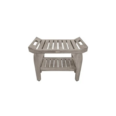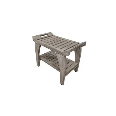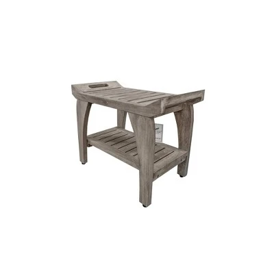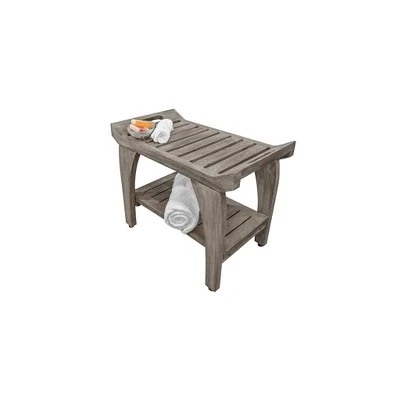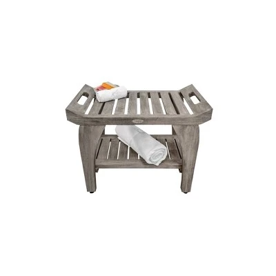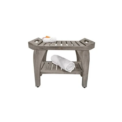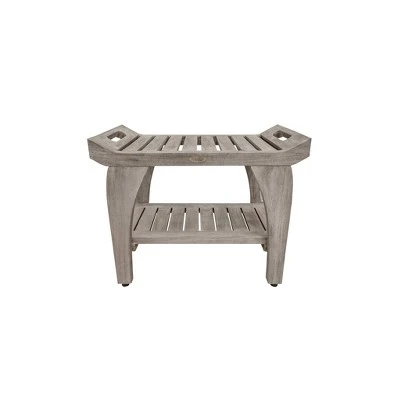 Tranquility 24in Wide Teak Shower Bench with Handles. This shower seat with extra shelf measures 24 inches in length, 14 inches in depth, and 20 inches in height, with a seat height of 18 inches. As a family owned company for over 10 years, we are proud to present this bathroom seat, manufactured from solid, sustainably sourced, certified legal teak from the island of Java in Indonesia. This piece features our Antique Gray finish, which is mostly gray, with the yellows and browns from the teak showing through.