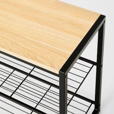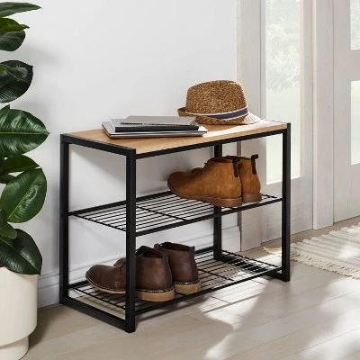 Keep shoes off the floor and the entryway uncluttered with the 3-Tier Entry Bench in Black Metal with Natural Wood from Brightroom™. This entry bench is a great pick for keeping any space organized, but it’s particularly convenient for a closet, entryway or mudroom. The two shelves are perfectly sized to each hold a few pairs of shoes, or combine with organizers for handy shelf storage. This metal entry bench includes a natural wood top for placing a hat, keys and more, and the black finish easily coordinates with any dĂ©cor theme.