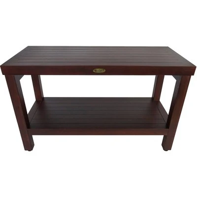 Eleganto 30in Wide Teak Shower Bench with Shelf. Measuring 30 inches in length, 14 inches in depth, and 18 inches in height. This shower bench works great indoors or outdoors. The included foot leveler pads allow independent adjustment of each leg to make minor adjustments for slight slopes in shower floors and to provide added non-slip stability. The finish, a woodland brown, will look great in your home.