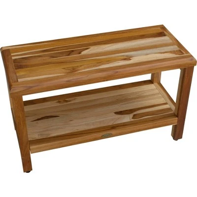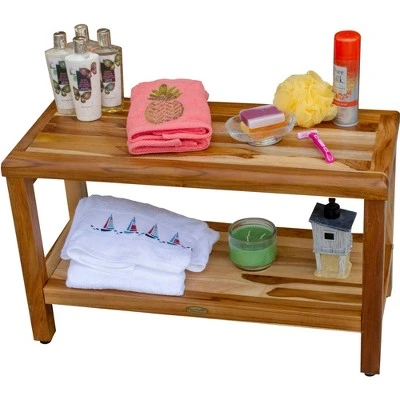Eleganto 30in Wide Teak Shower Bench with Shelf. Measuring 30 inches in length, 14 inches in depth, and 18 inches in height. This shower bench works great indoors or outdoors. The included foot leveler pads allow independent adjustment of each leg to make minor adjustments for slight slopes in shower floors and to provide added non-slip stability. The natural look of this finish will look great for years to come, making it perfect for your home.