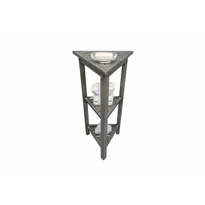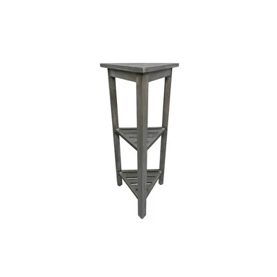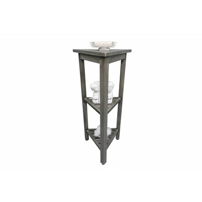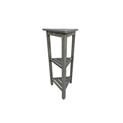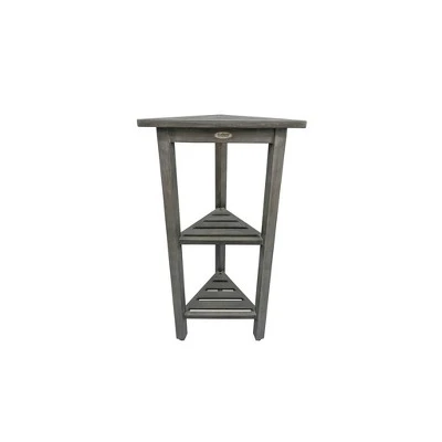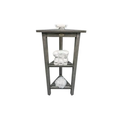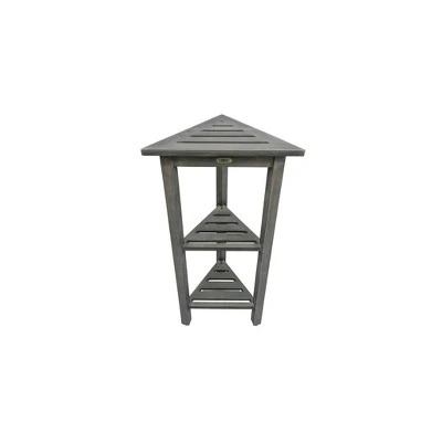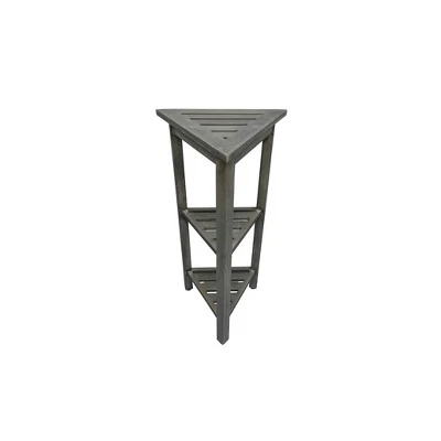 FlexiCorner 32in Tall Teak Shower Storage Shelf. With each side measuring 17 inches, this Equilateral triangle has a depth of 15 inches, and a height of 32 inches. The included foot leveler pads on this bathroom organizer allow independent adjustment of each leg to make minor adjustments for slight slopes in shower floors and to provide added non-slip stability. This piece features our Antique Gray finish, which is mostly gray, with the yellows and browns from the teak showing through.