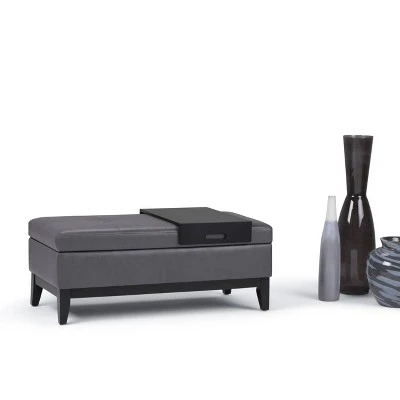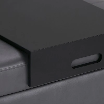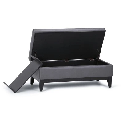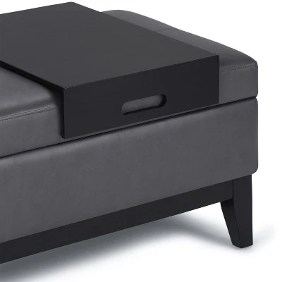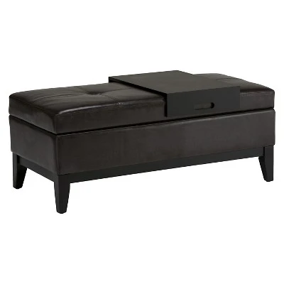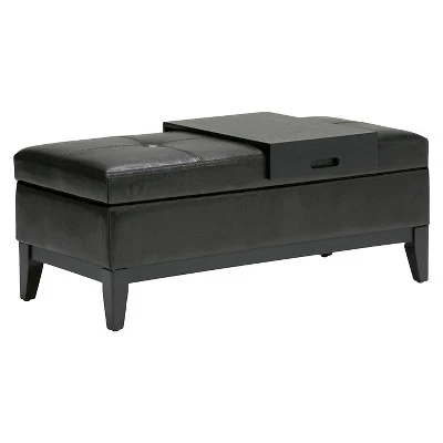 Jackson 42 inch Wide Transitional Storage Ottoman. Solid wood framed ottoman base. Features lift open lid, serving tray and large interior storage. Features child safety hinge. Simple assembly; just attach legs. Efforts are made to reproduce accurate colors, variations in color may occur due to computer monitor and photography. The product is warranted to be free from defects in material and workmanship to the original owner for the life of the product (conditions apply).