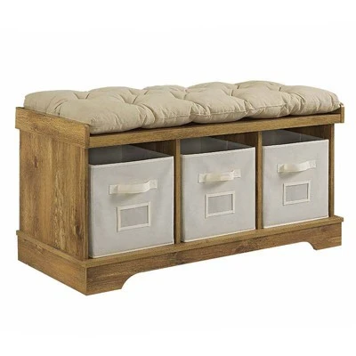 Whether you’re looking for utility, comfort, or style this storage bench from Saracina Home has it all. Three simple storage bins, that can have labels inserted in them, are underneath the bench to easily store your fabulous scarves, cozy throw blankets, or the celebrity magazines you secretly buy at the supermarket. This bench includes a tufted cotton cushion, adding comfortable seating to your space. Works well in a variety of rooms ranging from your entry way to your bedroom, as well as a wide breadth of styles such as traditional or modern farmhouse.