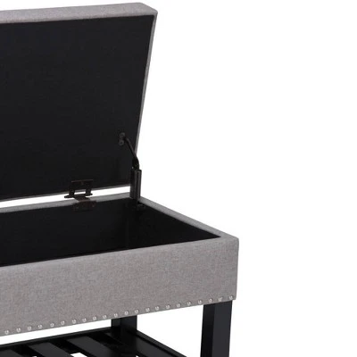 When the clutter is overwhelming, and you are looking for that perfect solution – look no further. For a stylish solution to your storage needs, the Riley Rectangular Storage Ottoman Bench features tufted detail, nail head trim and an open slat bottom storage area. A large interior storage space is located under the hinged lid. The unit is upholstered with durable fabrics and is extra strong and sturdy. Whether you use this Ottoman Bench in your entryway, living room, family room, basement or bedroom, this practical attractive ottoman comes in a variety of colors and upholstered options.