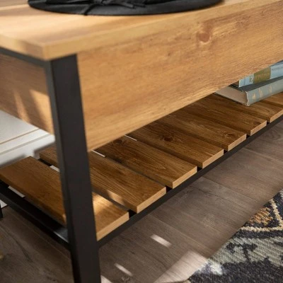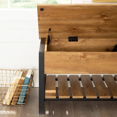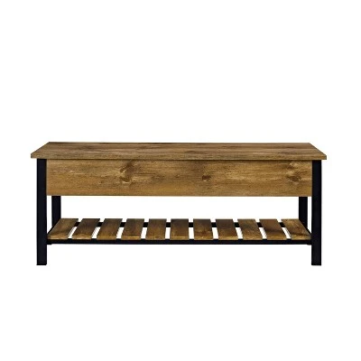This bench is both beautiful and functional, providing ample storage and a touch of rustic industrial style for your home’s entryway or hallway. The natural-looking wood finish made of high-grade MDF and powder coated metal give it a unique design that’s sure to complement a variety of home dĂ©cor. The open top storage space as well as the bottom slatted shelf are the perfect place for your shoes and accessories that you’ll need when you’re headed out the door.
