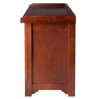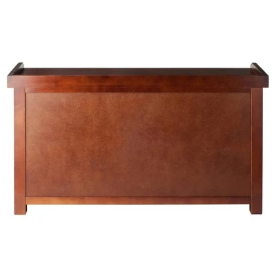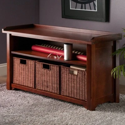 With its subtle design and rich antique walnut finish, this storage bench will be right at home in a variety of settings. Storage Bench with Three Baskets includes a contemporary wood hallway bench with three espresso-finished rattan wicker baskets. In addition to its refreshing style, this storage bench offers versatile storage space on its two spacious shelves. Ideal for your entryway, family room, or bedroom, this fashionable storage bench will make the most of the space its given in your home.