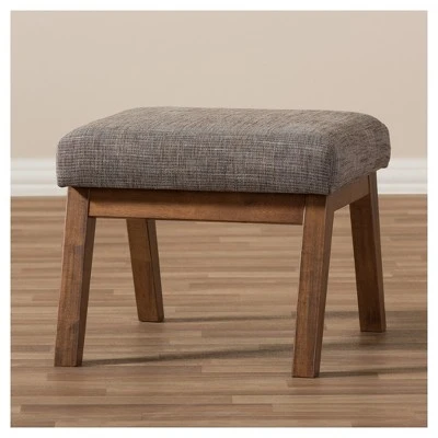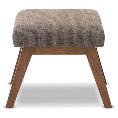 Mid-century modern style makes this handsome ottoman a true charmer. This minimalist footstool pairs the dark walnut finished exposed wood with the superb softness of gravel gray and brown upholstery. Perfect for living room, study or office, the simplicity in design leads the mid-century modern feel of this piece of furniture. Created to be the companion of the Aberdeen lounge chair, the Aberdeen looks cool by itself as an ottoman or footstool. Made in Malaysia, the ottoman requires assembly.