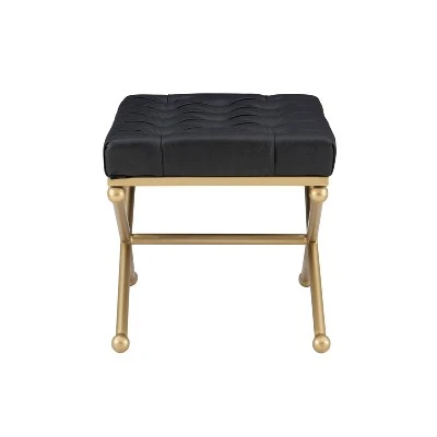 An ode to extravagance of a lost era, this stool is a flashy option for extra seating or a foot stool in your bedroom, home office or living room. The iron frame stands in a sturdy x pattern and is covered in a gold powder coating that shines in the light. Positioned above the base is a tufted cushion covered in black faux leather for comfort and easy upkeep. This piece arrives fully assembled equipped with feet glides to protect your floors.