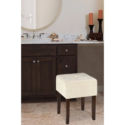 - Upholstered backless square vanity stool with a button tufted seat and detailed stitching