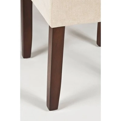- Sleek and sophisticated design features simple tapered wood legs in a rich dark brown finish with a beige upholstered seat