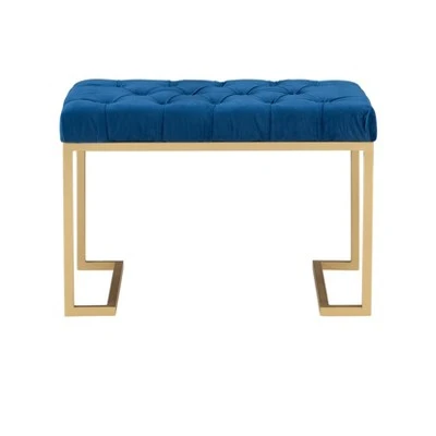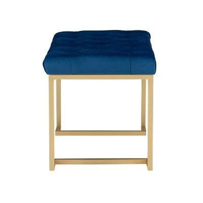 A plush cushion is upholstered in navy blue velvet to create the regal aesthetic of this bench. The iron frame is finished in a gold powder coating that shines in the light and pairs wonderfully with the tufted seat. This royal color scheme, fit for nobility or the humble furniture enthusiast, is sure to bring new excitement to your gallery, sunroom, living room and the like. The piece arrives fully assembled and supports up to 300 lbs.