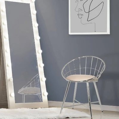 The round disc metal vanity stool has a retro design with a ultra modern style. The dazzling wire basket back design with metal construction in a chrome finish give the stool an inviting and futuristic touch. The comfortable round seat is upholstered in a neutral cream velvet fabric. The open metal work gives the metal vanity stool a lightweight translucent look which fits seamlessly into any decor. Ideal for your bathroom or bedroom seating area. Assembly required.