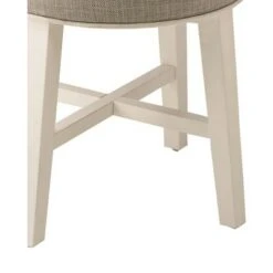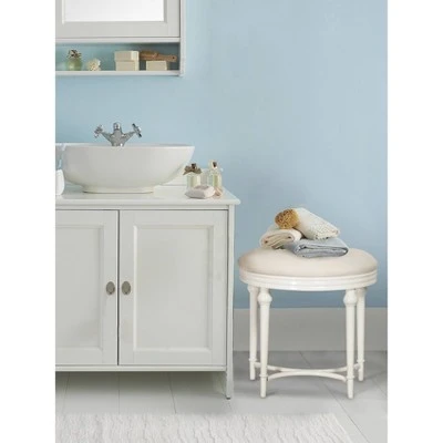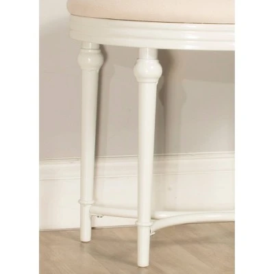 Airy and crisp. The Hillsdale Furniture Cape May Vanity Stool is the perfect seat for rooms with coastal cottage décor. The White metal base features simple bottom castings as well as turned finial castings near the top of the tapered legs. A grooved seat deck and asymmetrical curved support beams introduce an element of breezy movement. The neutral Off White linen upholstered seat gently offsets the fresh White metal base. This vanity stool is ideal at the bathroom or bedroom vanity set or can be used as a dressing seat. Some assembly required.