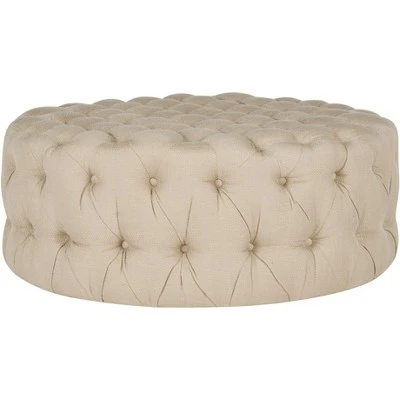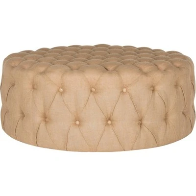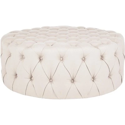 Brimming with sophistication, this ottoman recalls 1930s Hollywood glamour with its lavish button tufted upholstery. The oversized round shape and lush but sturdy surface allow it to serve double duty as a wonderful coffee table or extra seating. Care Instructions: To prevent overall soiling, frequent vacuuming or light brushing is recommended. Cushions and pillows should be turned on a weekly basis. Down filled cushions should be brushed rather than vacuumed. Spot clean, using a mild water free solvent or dry cleaning product. Only a professional cleaner should undertake a complete overall cleaning. The use of steam or water based cleaners may cause excessive shrinking or staining.
