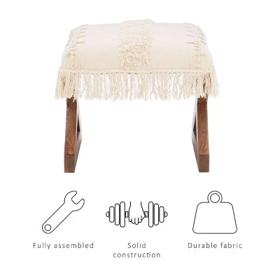 Put your feet up on this renaissance style pouf top ottoman with bohemian tassel skirt. Perfect for extra seating when entertaining or as a multipurpose place to fold laundry, sit with your TV dinner or put a book down. Sturdy construction supports up to 200 lbs. and beautifully embroidered cushion adds touch of elegance and sophistication to living room, den or sitting area. Rich wood grain finish brings warmth to home decor. Lightweight design comes fully assembled.
