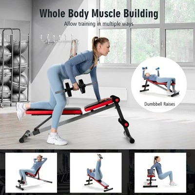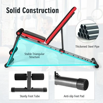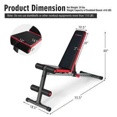 This multi-function weight bench will be a perfect exercise equipment of your home gym and bring your daily fitness more convenience.. The entire bench is constructed with super sturdy steel frame to ensure your safety in training all the time. By adjusting the backrest angle to the desired position within 9 levels, you can exercise in inclined, flat and dropped way for different workout intensities and postures. The 2 » multi-layer cushion will improve your fitness experience with the breathable PU leather and high-density foam. The bench features an ideal size which is suitable for most people to use it for fat loss, body-shaping, muscle building and so on. You can do bench press, sit-up, dumbbell lift and other exercises just like that in the gym. . Specification: Color: Black and Red. Material: Steel, PVC Foam, PU. Overall Dimension: 55.5 » x 18.5 » x 40 » (L x W x H) . Size of Backrest: 28 » x 10.5 » x 2 » (L x W x H) . Size of Seat: 14.5 » x 13 » x 2 » (L x W x H) . Net Weight: 29 lbs. Weight Capacity: 410 lbs. Note: Please do not use dumbbells or other workout equipments more than 110 lbs. . Package includes: . 1 x Weight Bench. 1 x User Manual.