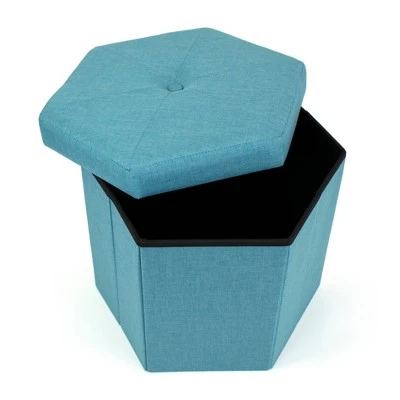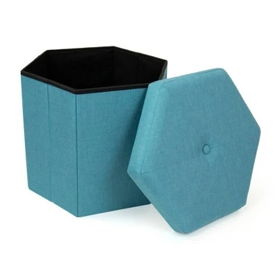 Upgrade your storage system and hide away clutter with the Humble Crew Devon 16″ Hexagonal Upholstered Collapsible Storage Ottoman . Modern storage ottoman with tufted cushioned top features spacious interior storage compartment ideal for blankets, linens, magazines, books, remote controls, electronics, toys and much more. Collapsible ottoman folds away flat for storage in closets or under beds; sets up in seconds for additional seating. Perfect for dorms, RVs and small apartments. Ideal size for use as a comfy padded footrest or stool. Product dims: 14.96″ x 16.93″ x 14.96″. Durable MDF structure supports up to 220 lbs.