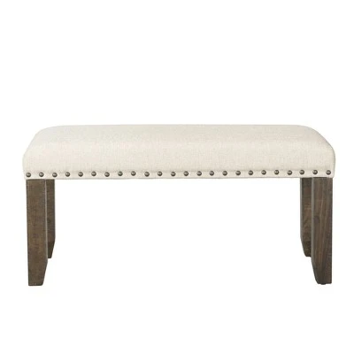 The Picket House Furnishings Dex Dining Bench gives your dining room a hint of rustic charm. Its comfy seat is upholstered in a charming cream linen and accented by metal nail heads. Smokey walnut finished legs featuring distress marks give this chair a weathered and cozy look. Add this dining bench to your home today for a look that you will love to eat every meal at, day after day!