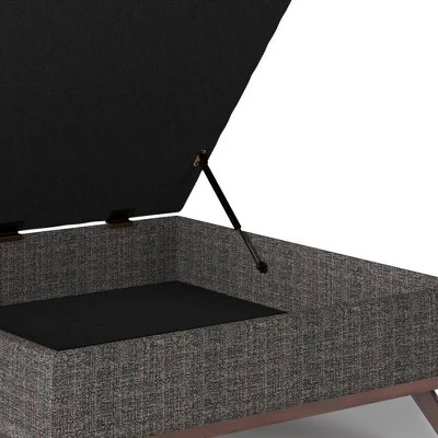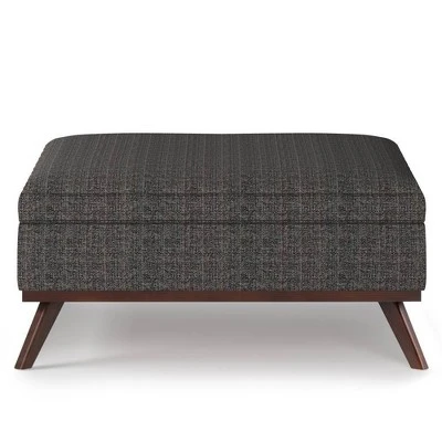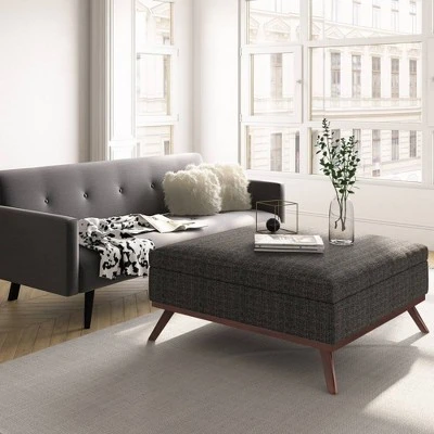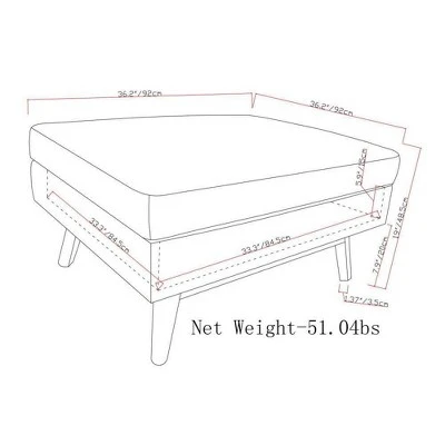Ethan 34 inch Wide Mid Century Modern Storage Ottoman in Mid century style. Top easily lifts to reveal a storage compartment. Available in Distressed Saddle Brown, Distressed Black, Distressed Chestnut Brown and Distressed Taupe. Simple assembly; just attach legs. Efforts are made to reproduce accurate colors, variations in color may occur due to computer monitor and photography. The product is warranted to be free from defects in material and workmanship to the original owner for the life of the product (conditions apply).