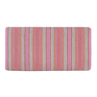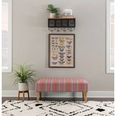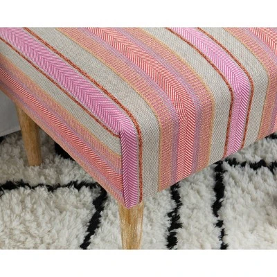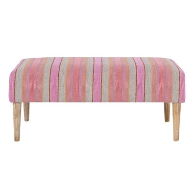 Create an impressive entryway with this boho bench. The elegantly striped heavy weight fabric makes this a piece like no other. It is the perfect length to place under framed art with a plant to welcome you home and use as additional seating for guests. The multipurpose bench also fits nicely beside dining tables or at the foot of a bed. Its comfy seat features thick, upholstered fabric in a beautiful red, pink and gray design that adds a bright splash to existing decor. Natural wood legs offer a sturdy, rustic touch.