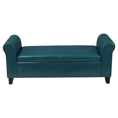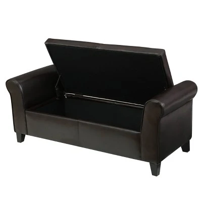 Now you can kick up your feet and enjoy your clutter free living room with this Christopher Knight Home Hayes Faux Leather Armed Storage Ottoman Bench. Upholstered in a soft faux leather and set on strong brown stained legs, this item is both versatile and durable. Use this Christopher Knight Home Hayes Faux Leather Armed Storage Ottoman Bench to put your feet up on after a long day or as extra seating in your living room. You will not regret this purchase!