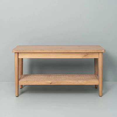 Liven up the look of your home with this Wood & Cane Bench from Hearth & Hand™ with Magnolia. This natural wood bench features a wooden frame and tapered legs, adding a touch of mid-century style to your decor. Whether you’re using this rectangle bench as an accent bench alongside a staircase or in your home office, it brings easy style and space to any room.