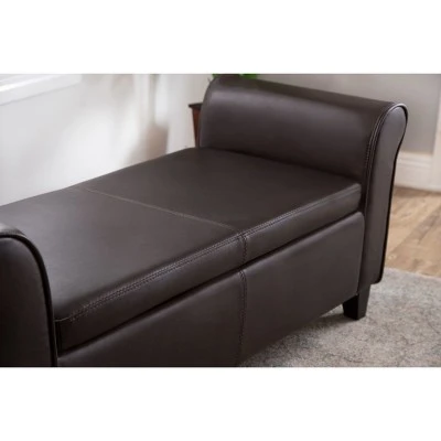 An equally convenient and sophisticated accent to your home, the Henry Leather Storage Ottoman from Abbyson Living is sure to impress in many ways. This handy storage ottoman is perfect for storing blankets and pillows at the foot of your bed, or even shoes in your entryway or dressing room. The seat cushion features dense foam cushioning to provide a comfortable seat. Rolled arms on each side frame the piece nicely to give it an interesting and stylish shape. The faux leather upholstery comes in a rich espresso brown color which sits nicely atop the wood legs of the same finish. Wherever you place it, you’re sure to find good use for it and enjoy the stunning and timeless look of this handsome piece.