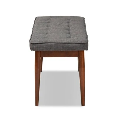 Transform your dining room with the elegance and comfort of the Itami dining bench. Constructed from solid rubberwood, the Itami showcases a stunning medium oak finish that complements the gray fabric upholstered seat. The seat features button tufting and piping trim for a touch of refinement. Mid-century modern design inspiration is evident in the low profile and angled, tapered legs. This versatile piece works well as seating at a dining table, or can be used as an accent piece in the entryway. The Itami bench is made in Malaysia and requires assembly.