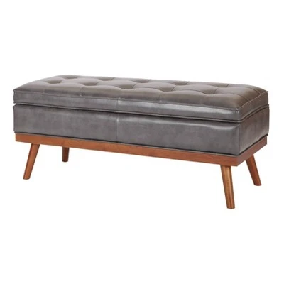 Update your entry with a Mid-Century Modern statement piece that doubles as extra home storage. This plush, button tufted storage bench sets the mood as guests enter your home and offers a spot for purses, backpacks or shoes. Place in front of a sofa for a soft place the kick your feet up while storing all your blanket throws. Modern, tapered, solid wood legs provide stability, while the soft-close hinged top allows for easy access to the fully lined storage space. Complete your home style with the Katheryn storage bench.