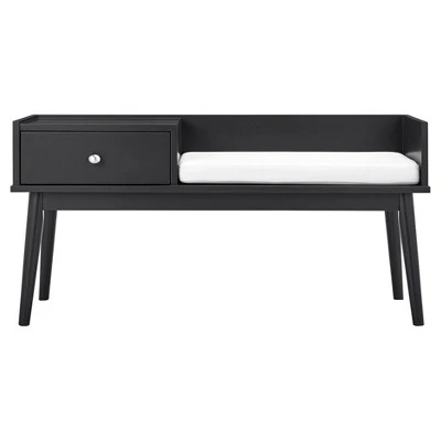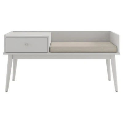 This Keating Mid-Century Telephone Bench from Inspire Q brings storage and comfortable seating to any living space in your home. This bench features a sturdy wood construction with four tapered legs that add a subtle touch of style. It has a small pull-out drawer for storing daily life essentials, along with a padded seating area that fits one person comfortably. The top of the drawer is flat so you can display any small decor items like books, a vase or even small potted plants. The seat has a neutral-colored linen pad for extra comfortable sitting when putting on shoes or getting ready in the morning. Place this wood bench with a drawer in an entryway, living room or even by a walk-in closet for a touch of functional style.