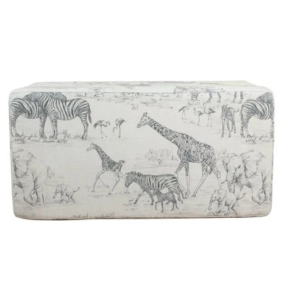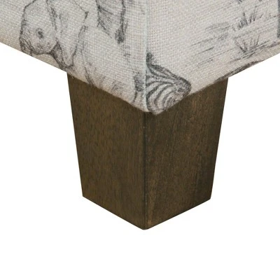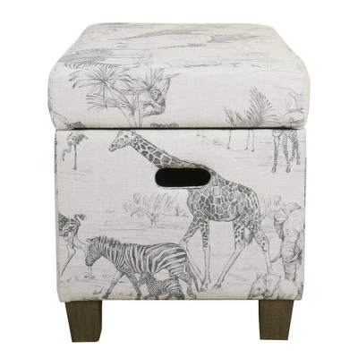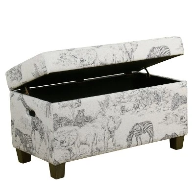 Our Kids’ Jungle Storage Bench can corral your kids’ toys, add whimsy to a bedroom or brighten up a playroom. The gray toned safari print has a hand drawn look that spans style and gender. With wood legs in a gray washed finish, our kids’ bedroom storage bench provides kid-sized seating and child-friendly storage. With a hinged lid top, our kids’ storage bench is easy for small hands to open and close and can help keep the toy collection manageable. Easy to assemble and maintain.