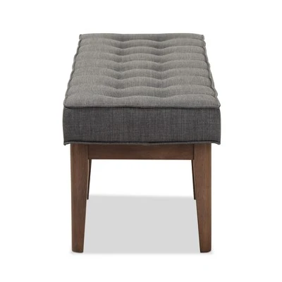 Perfect as a large seat in the dining room or in the entryway as an occasional piece, the Lucca mid-century modern button-tufted bench features clean lines on the walnut finishing wood frame and upholstery for contemporary style influenced by vintage notes. Constructed of strong and solid rubberwood wood frame for a sturdy structure with lasting good looks, the seat is upholstered in polyester fabric for a soft feel with resilient quality. Button-tufted detailing instils a mid-century modern-inspired palette in your space. Made in Malaysia, the Lucca requires assembly. Dimensions: 17.72″ High x 54.02″ Wide x 17.99″ Deep; Seating Dimensions: 17.72″ High (from Floor) x 54.13″ Wide x 18.11″ Deep; Legs: 13.58″ High