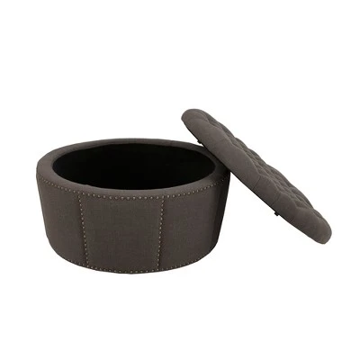 Complete your home decor with the style and functionality of the Roarke Storage Ottoman. Featuring a tufted top, this round storage ottoman is upholstered in a polyester and linen fabric, for a rich transitional look. The brass nail head trim around the base adds an elegant touch, while the ample storage space for your blankets and other essential items. Seamlessly blending functionality with beautiful style, this storage ottoman is the perfect addition to your living room or bedroom decor. No assembly required. Max weight capacity: 300lbs.