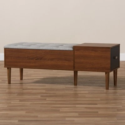 Dual-purposed and versatile, this bench is a great addition to your foyer, mudroom, utility room or bedroom. Featuring retro modern style, the Merrick is constructed of engineered wood and finished in two-tone finishing, oak and espresso . The fabric upholstered cushion provides a comfortable seating area and ample storage space when it is lifted open. The drawer on the right provides extra storage space for your hats, keys, gloves and scarfs. Silver hardware is in use to add modern tone. Shapely legs featuring mid-century style are constructed of solid rubberwood, supporting the seating storage bench. Made in Malaysia, the Merrick requires assembly. Dimensions: 17.36″ High x 46.8″ Wide x 15.6″ Deep; Drawer: 7.63″ High x 12.2″ Wide x 13.18″ Deep; Shelves: 7.7″ High x 15.13″ Wide x 14.4″ Deep; Cushions: 1.97″ High x 15.13″ Wide x 14.4″ Deep