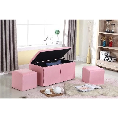 This contemporary and stylish storage bench with two matching Ottomans (12″x12″x13″) is designed to adapt to any room while providing additional seating room for you and your guest. With the conveniently hidden storage space making this bench quite practical for holding books and magazines, up to 4 cubic feet in extra space (32″x15″x15″). Double spring hinges seat flap is designed for easy open or securely close when needed. The bench is finished with a pink microfiber fabric for coziness and maximizing comfort level. Supported by sturdy internal metal and wooden frame. Minimal assembly required.