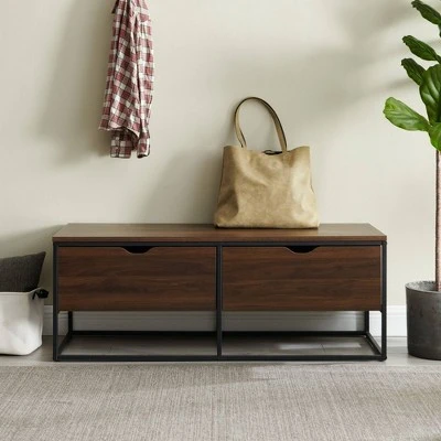 Spruce up your entryway or mudroom with this Modern 2 Drawer Entry Storage Bench by Saracina Home. Two spacious drawers are your new go-to spot for hats, scarves, and outdoor gear. The sturdy MDF and metal box frame will support you during every shoe-tying pit stop. Cut-out handles not only make the drawers easy to open, but also emphasize the sleek, contemporary profile.