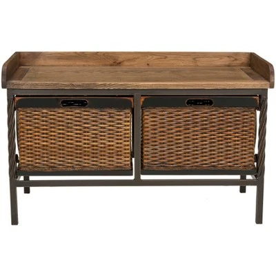 The Noah wooden storage bench is a welcome addition to an entry hall, mud room or family room. The elm wood seat with an oak finish is the perfect place to remove rain boots or shoes, and its two oversized wicker-style baskets tucked in an antique pewter frame offer a discreet yet ambient storage solution. Whether used to stow blankets, toys or boots, the Noah bench is big on storage and casual style. The Noah bench is a great fit for Country, Mission, Nautical, Rustic, Shabby or Transitional style interiors.
