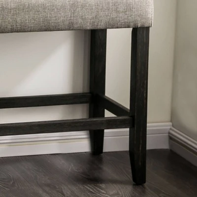 Elegant and graceful, this counter height bench from the Norelo collection is perfectly suited for a rustic style dining space. Slide this bench up to a tall dining table or breakfast counter and spend long meals chatting with friends and family rested upon a long cushion wrapped in a light gray linen-like fabric. With antique black finished legs and brace supports, this bench also adds a pop of contrast to any room.