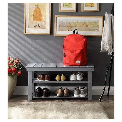 Welcome your guests with the Oxford Utility Mudroom Bench with Shelves by Breighton Home. Not only will it spruce up your living space, but it provides a beautiful contemporary style to refresh your own. With comfortable seating and two lower shelves, this entryway furniture is the perfect storage solution you have been searching for. It is perfect to sit and take off your shoes after a long day at work while keeping them close by in the lower section. Not only is this foyer unit crafted from MDF and solid wood, but it is also finished with a beautiful non lead based paint. Place in your living room, entryway, den or home study, and enjoy its multifunctional feature. Enjoy right away with its easy 3 step assembly. Available in multiple finishes, this hallway storage bench complements any home decor. Find more furniture pieces from the Oxford Collection by Breighton Home. Each sold separately.