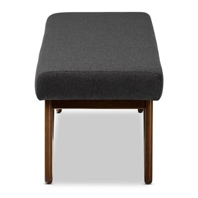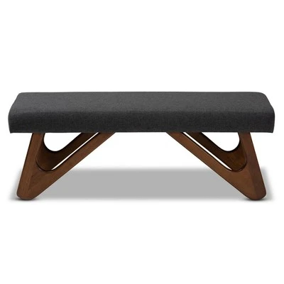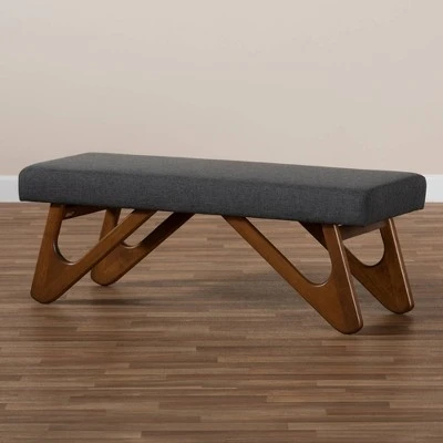 Striking from all angles, the Rika bench adds a playful retro flair to any space. Crafted from wood, the Rika is upholstered in a chic gray polyester fabric. Plush foam padding provides comfortable seating. This unique piece features four boomerang-shaped legs, each finished in a walnut brown. Place this work of art in the living room, entryway, or bedroom. The Rika bench is made in Malaysia and requires assembly.