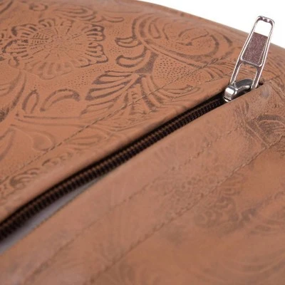 - Versatile round shape features on trend patterned genuine leather with stitching detail