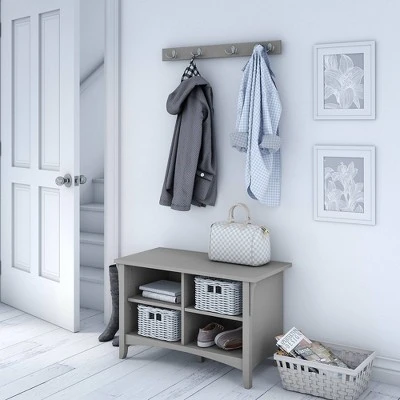 Add the Bush Furniture Salinas Shoe Storage Bench to your home’s entryway and enjoy versatile organization with timeless Mission styling. Have a seat on the spacious top while you put on or take off your shoes. Four cubby shelves organize your entryway so you’re not tripping over footwear when you walk in the door. Set your bags down on top of the Shoe Bench while you take off your coat. Available in three attractive finishes, the country feel of the Storage Bench looks great even beyond your entryway. Two adjustable shelves hold various items in any space, including a bedroom or hallway. Tapered legs, a curved base and decorative wood detailing complement the casual homes of today. Attach the coordinating Salinas Hall Tree (sold separately) for an all-in-one organization solution with three Tumbled Pewter double prong hooks to hang coats, hats and scarves. Backed by a 1 year warranty.