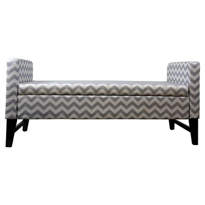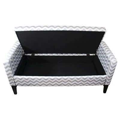 Ore International’s Chevron Storage Bench is a clean-lined bench that helps you clean up with a hinged lid that opens to a hidden storage space. Features a hinged lid that opens to a generous storage space ideal for linens, clothing, and accessories. Safety hinges ensure fabrics don’t get caught up inside them, and dark espresso-finished legs and side rails are trim and tailored. Features comfortable padding with plush upholstery over sturdy frame. This plush fabric bench adds modern flair to casual seating.