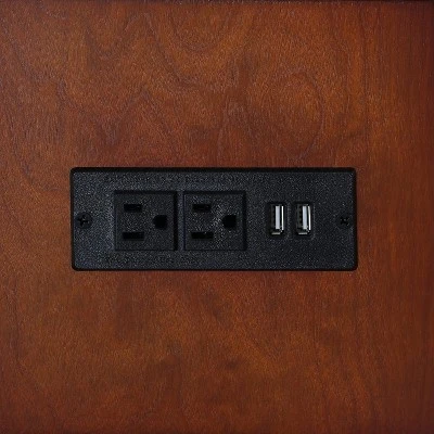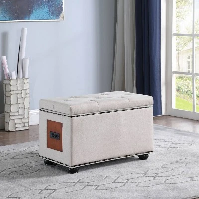 Innovative ottoman with a certified charging station that features 2 outlets and 2 USB ports. You can easily use your laptop or charge your phone while sitting on your ottoman or use as a footrest while watching TV. A tufted diamond shape surface is decorated in nailhead trim underneath for a refined look, while its metal hinge on both sides opens up to offer an ample storage compartment. Available in brown or gray.